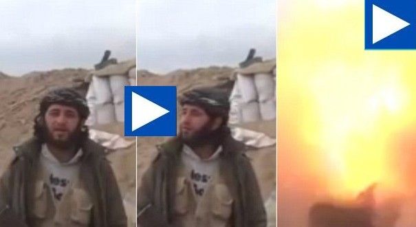 Ανατριχιαστικές εικόνες είδαν το φως της δημοσιότητας από τη στιγμή που βόμβα του Συριακού Στρατού χτυπάει τζιχαντιστή στη Χαμά της Συρίας. Στο βίντεο των 40 δευτερολέπτων ο τζιχαντιστής και ο εικονολήπτης ετοιμάζουν ακόμη ένα προπαγανδιστικό βίντεο για τις νέες νίκες που πραγματοποίησαν στις μάχες οι τζιχαντιστές.